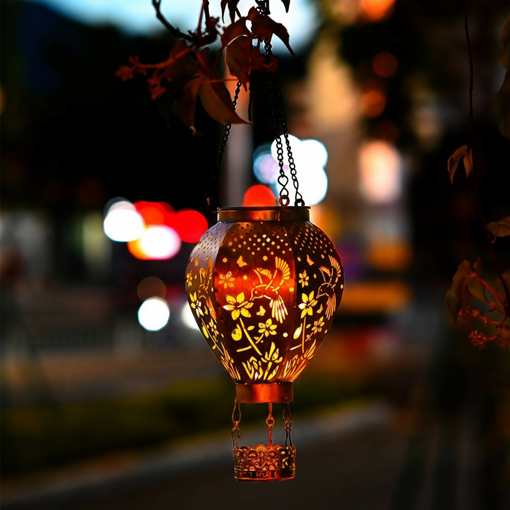 De lamp laadt zichzelf overdag op via het ingebouwde nikkel-zonnepaneel en schakelt automatisch aan bij schemering. Dankzij het duurzame metalen ontwerp en de stevige ophangkettingen kun je hem eenvoudig plaatsen aan bomen, veranda’s, pergola’s of tuinpalen.